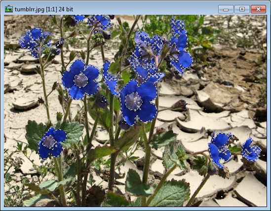 The selection wand automatically selects areas of similar color adjacent to the place where you left click the mouse. You can set the tolerance range for colors that the wand will select. The default is 20. If you set the tolerance to zero, nothing will be selected. If you set it to 255, the entire image will be selected. The tolerance is set by clicking on its icon on the woolbar as shown in the image above. This icon only appears on the toolbar when you use the selection wand. You may use the left mouse button to click on as many areas as you like to add areas to the selection. Use the right mouse button to subtract areas from it. The Invert selection option on the Edit menu is also available with selections created with the selection wand.