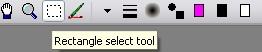 You get to the rectangular select tool by clicking on its toolbar icon or by pressing F8 once or twice. The icon shows a selection marquee, the dotted lines that appear around a selection. To make a selection, just hold down the left mouse button at the corner where you want to begin and drag the mouse (and cursor) to the diagonal corner. Release the button and your selection is completed. You may modify your selection by draging the sides or corners of the marquee while holding down the left mouse button. You may also move the selection within the image. When the cursor is inside the selection, it will appear as crossed arrows. Hold down the left mouse button and drag the selection in any direction.