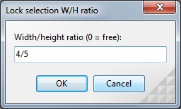 The first step in planning your print is to know what size print you want. Your image must have the same Height/Width ratio as the print size you desire. The table also shows the Height/Width ratios of the most common image sizes in both horizontal and vertical formats. Click Lock selection H/W ratio... on the Edit menu (last option) and enter the ratio you need in the dialog box. The default setting is zero, which unlocks the ratio to allow for free selection.